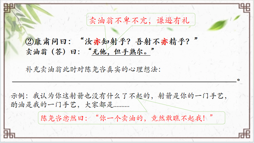 总结:副词“亦”字体现了陈尧咨的骄傲自大,恃才傲物,骄矜暴躁;体现了卖油翁作为一个低位者对高位者两种不同技艺的从容淡然,对自身高超技艺的谦逊。
