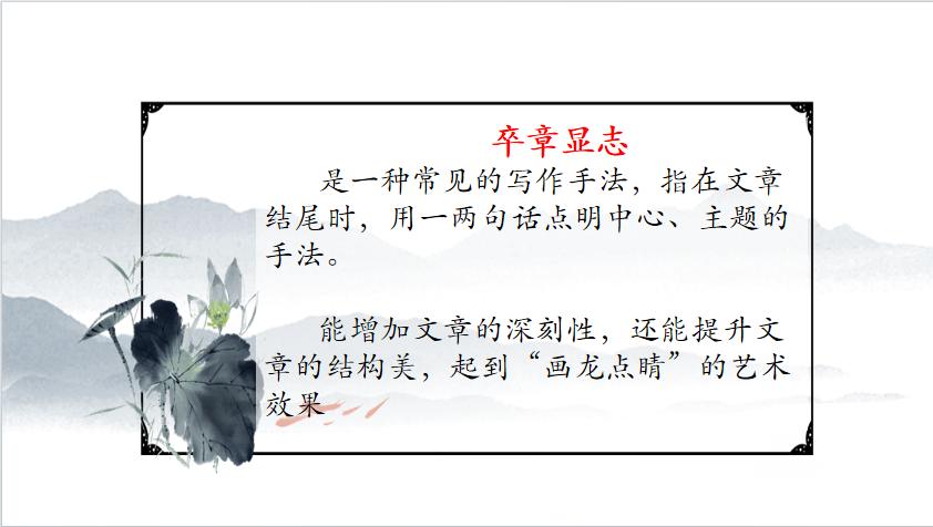 明确:都倾向选择结尾位置抒发情感。在文学创作中,这叫“卒章显志”(写作手法)。