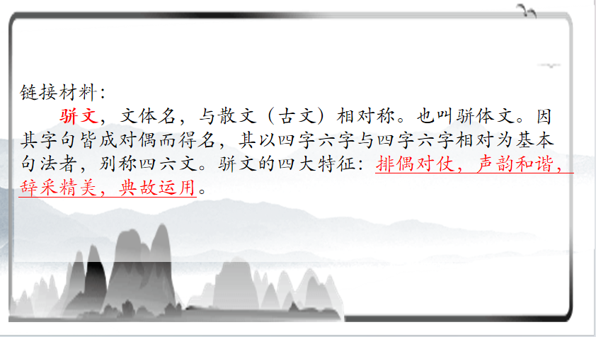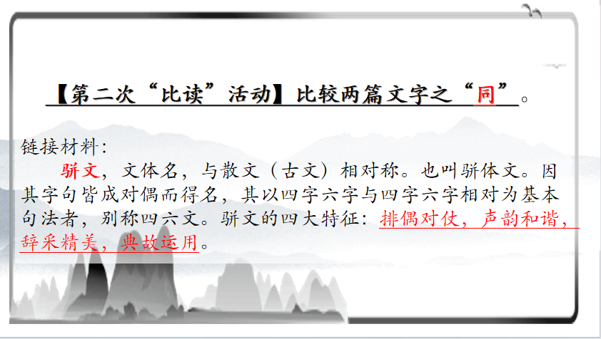 明确:两篇文章都为骈体文,看句式排偶对仗,读声韵和谐流美,观用词精巧清丽,语言都运用了典故。
